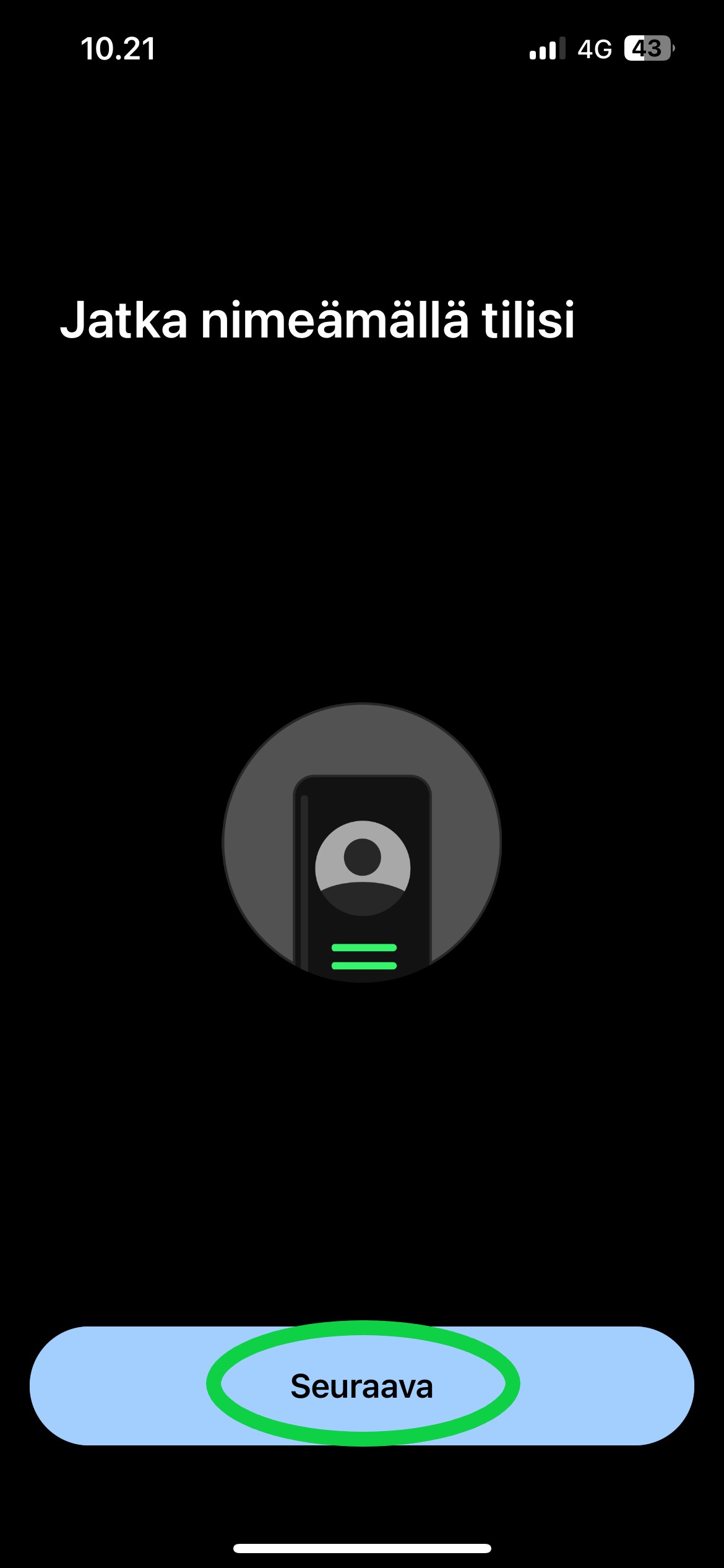 Valitse Maakoodi -kohtaan pudotusvalikosta Suomen maakoodi +358 ja kirjoita puhelinnumerosi maakoodi huomioon ottaen (ensimmäinen numero jää pois, eli jos numerosi on 040 123 4567, kirjoita ruutuun 40 123 456). Klikkaa tämän jälkeen ”Jatka”.