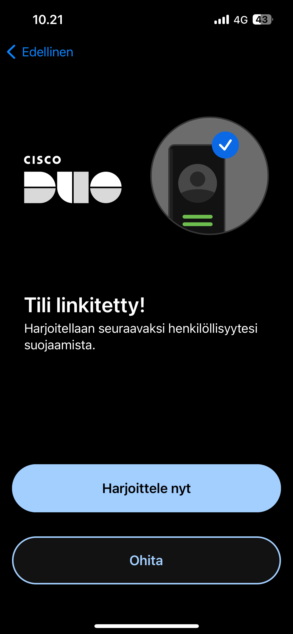 Seuraavaksi Duo Mobile- sovellus ehdottaa, että harjoittelisit Duo Mobilen käyttöä. Voit valita harjoittelun tai ohittaa sen valitsemalla "Ohita".