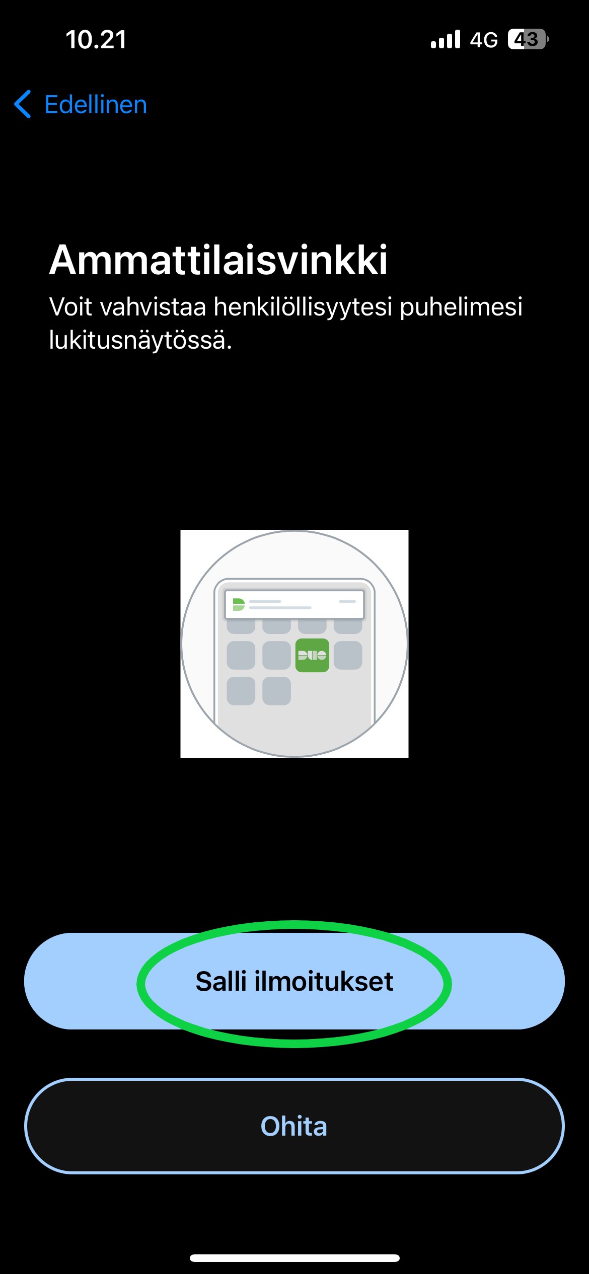 Ilmoitukset sallimalla saat tunnistautumis pyynnön puhelimen "ilmoitus valikkoon" josta se on nopeampi hyväksyä. Suositellaan valitsemaan "Salli ilmoitukset".