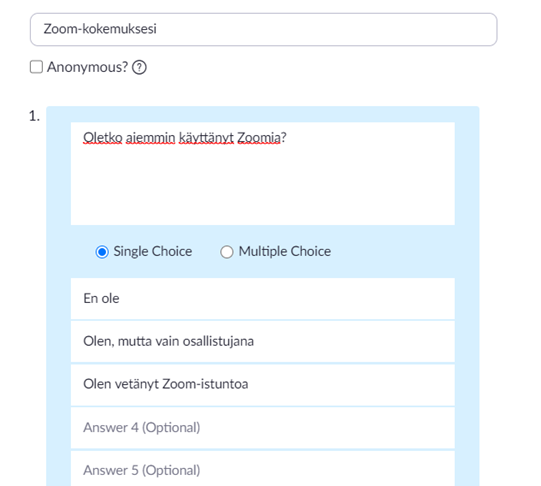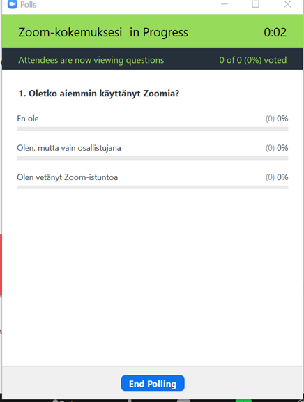 Host voi tehdä etukäteen yksinkertaisen kyselyn (tai istunnon aikana), joka sisältää monivalintakysymyksen: valitse yksi tai monta.