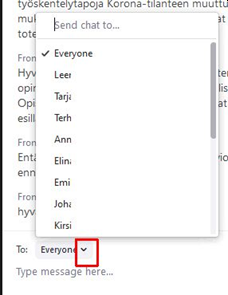 Oletuksena viestit ovat Everyone, mutta voit klikata ko. kentän päässä nuolipainiketta ja pääset valitsemaan henkilön, jolle lähetät yksityisviestin: