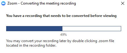 Muilta osin toiminta on samanlaista kuin aiemmassa kokouksen tallennusohjeessakin - kun lopetat Zoom-kokouksen, tietokoneesi muuntaa tallenteen julkaisukelpoiseen MP4-muotoon.