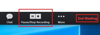 The recording starts when you click the Record button in the bottom of your Zoom screen. While recording you can pause or stop recording as shown on the picture above. You can also see the End Meeting option highlighted, which will end the meeting and enables the conversion of the meeting to a MP4 video recording.