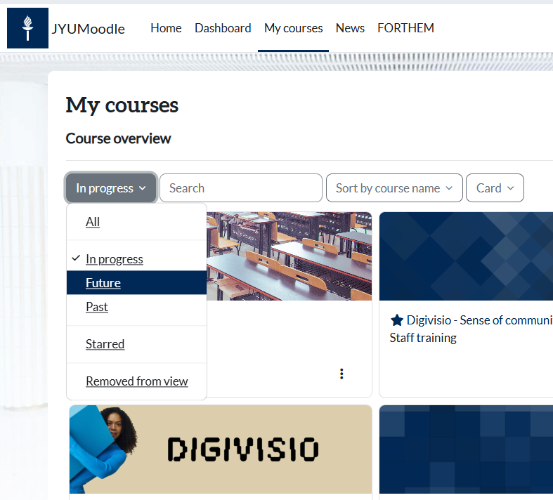 Find the course in Moodle with Find in the header or browse it from the list of courses on your Dashboard, if the teacher haven't send you the link to the course via email. No enrolment key is needed, if course is connected to Sisu registration.