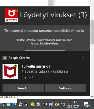 Yliopiston koneissa käytetään haittaohjelmien torjuntaan Windowsin omaa torjuntaa. Jos saat kuitenkin haittaohjelma ilmoituksia jossa mainitaan jokin muu torjuntasovellus olet käynyt jollain epämääräisellä verkkosivulla ja sallinut sen lähettää ilmoituksia. Alla esimerkki.