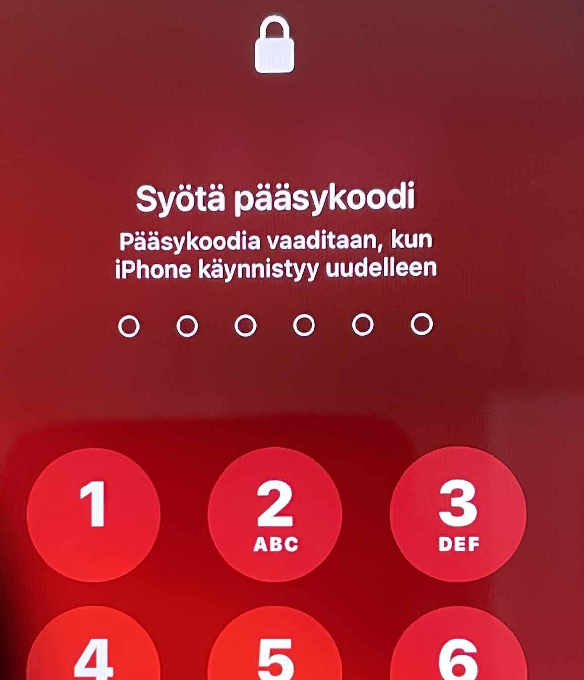 Iphone laitteessa kysytään ensin näytön lukituskoodi.