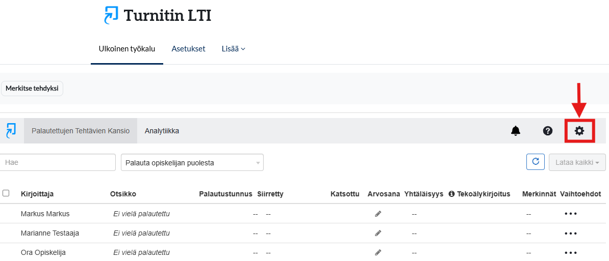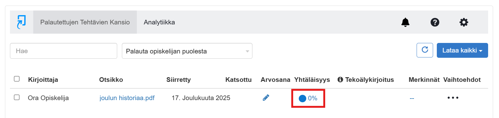 Palautettujen Tehtävien Kansio- välilehdellä on opiskelijalista ja aktiviteettiin palautetut tiedostot. Opiskelija palauttaa aina itse omat tiedostonsa Turnitin -tehtävään.
