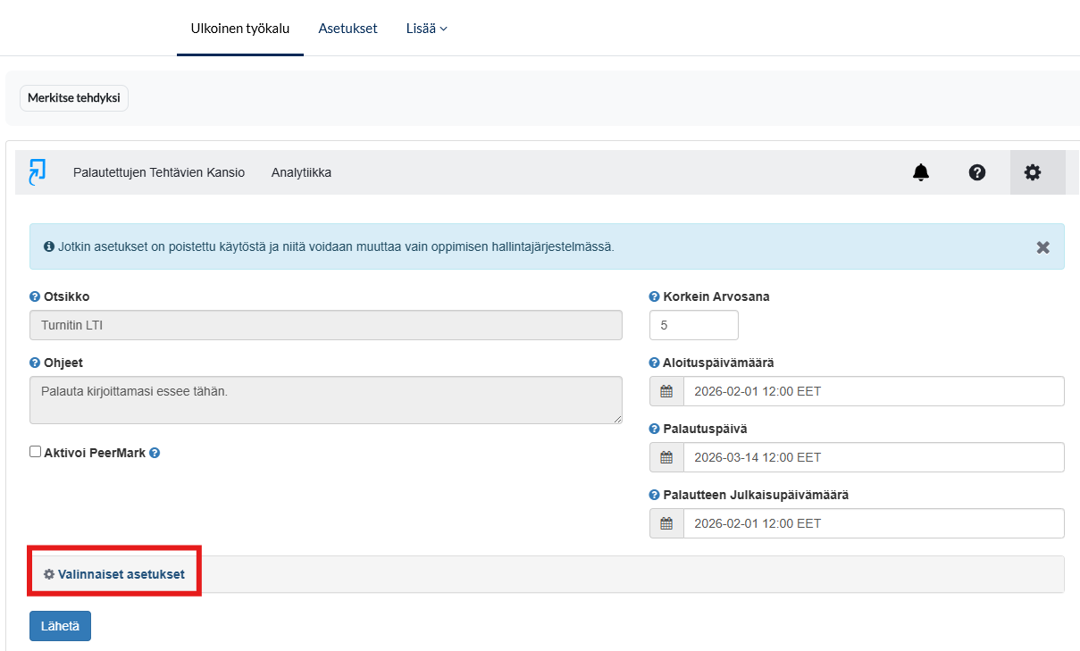 - Tallenna. Tallennuksen jälkeen on yleensä vähän viivettä ennen kuin Turnitin LTI aukeaa kurssialueelle.