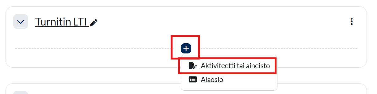 - Muokkaustila päälle, sisältökappaleen lopusta valitaan + -ikoni ja valitaan Aktiviteetti tai aineisto ja aktiviteettilistauksesta valitaan Turnitin LTI.