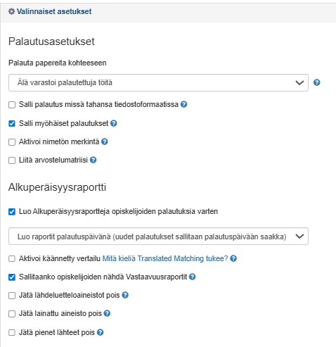 - Jos halutaan, että opiskelijat näkevät samankaltaisuusraportin, valitse Sallitaan opiskelijoiden nähdä alkuperäisyysraportit.
