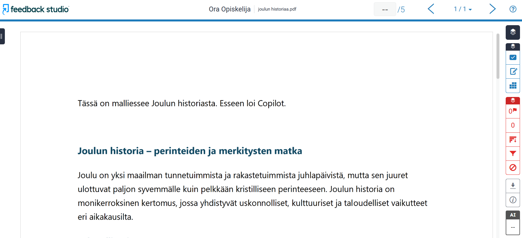 - Feedback studiossa opettajan-työkalut ovat tekstin vieressä oikealla. Siniset työkalut liittyvät arviointiin ja punaiset samankaltaisuuden tarkasteluun. Alimmaisena on tekoälyllä luodun tekstin tunnistustyökalu (AI), joka toimii tällä hetkellä vain englanninkielisillä, espanjankielisillä sekä japaninkielisillä teksteillä.