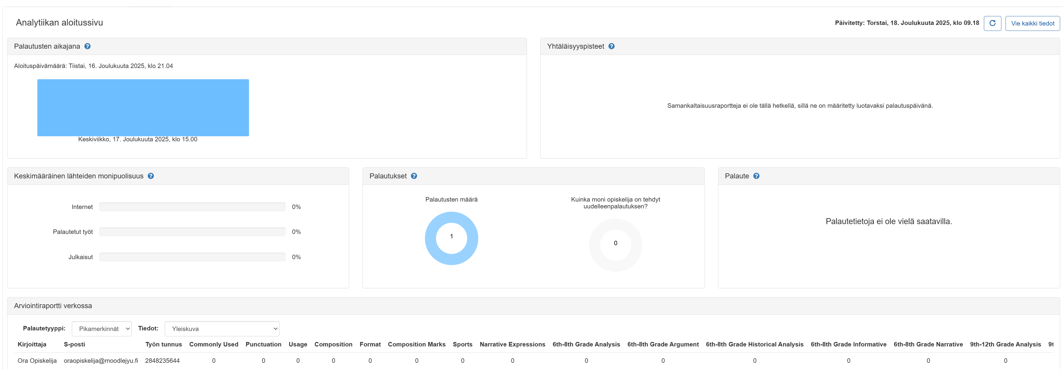 Turnitin LTI -aktiviteetissa on myös erillinen Analytiikka-välilehti, josta voi katsoa koosteen palautuksista.