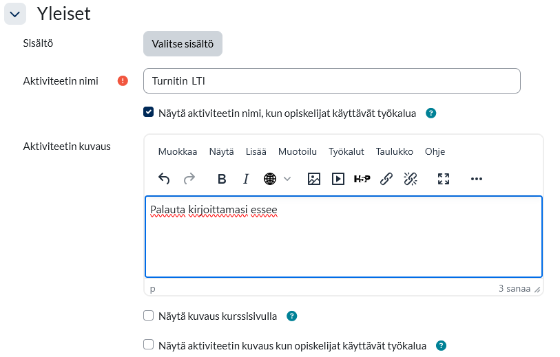 - Kirjoita aktiviteetin kuvaus-kenttään ohjeistus tehtävän palautusta varten.